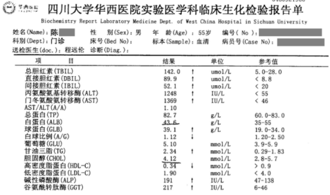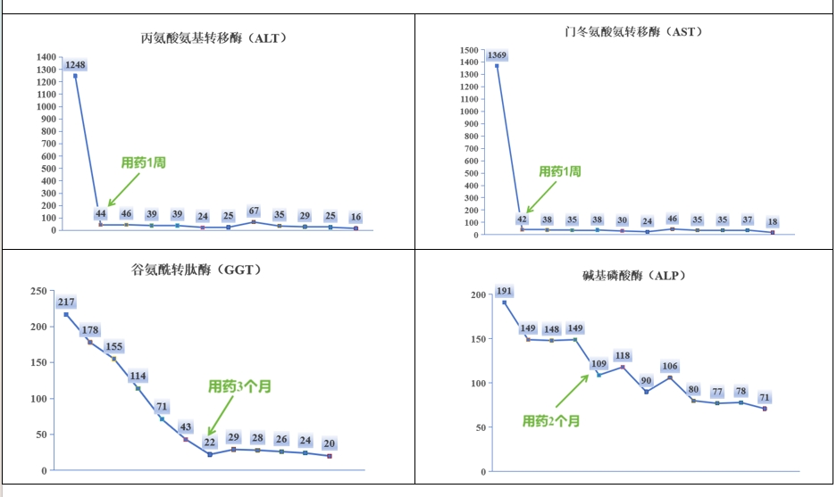患者用藥前影像學(xué)檢查報(bào)告顯示肝多發(fā)囊腫,甲胎蛋白(AFP)高達(dá)1210ng/ml(大面積肝壞死),醫(yī)院建議必須換肝,而且還不能保證患者是否可以獲得有效治療。 患者未采用手術(shù),隨后5年期間,患者長(zhǎng)期使用注射用綠原酸,未使用其他任何治療;5年后改為口服保健食品九樟牌咀嚼片(每年注射1個(gè)療程注射用綠原酸)。維持至今,患者各項(xiàng)指標(biāo)均保持正常水平,身體狀況良好,與常人無異。