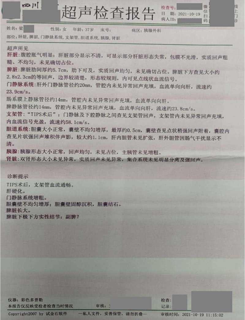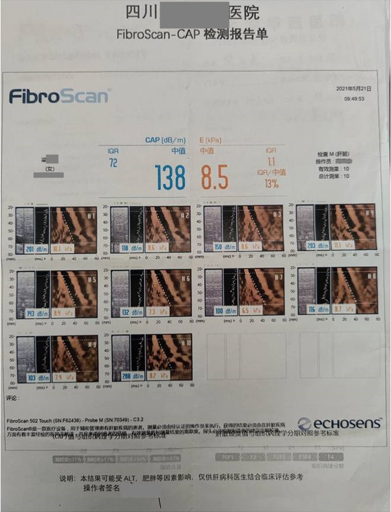 用藥前患者臨床診斷為肝硬化,脾臟腫大。確診肝硬化后的幾年間,患者采取多種治療方式,并調(diào)節(jié)飲食,肝硬度指標(biāo)有逐年好轉(zhuǎn)的趨勢(shì),但硬度仍處于較高數(shù)值。單獨(dú)使用注射用綠原酸1個(gè)月后,肝硬度指標(biāo)好轉(zhuǎn)(8.5→7.7),而且一直沒法解決的脾臟腫大問題,也得到了改善,脾臟厚度變?。?.0cm→5.7cm)?;颊叱掷m(xù)用藥至今,生活質(zhì)量得到較大改善,自我感覺精力變好,睡眠改善,食欲增強(qiáng),手指腫脹也基本消失。