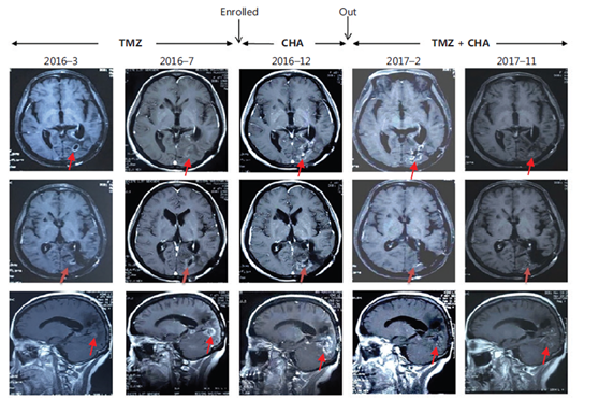 病例圖片來源 Kang, Z. , Li, S. , Kang, X. , Deng, J. , Yang, H. , & Cheni, F. , et al. (2023). Phase Ⅰ study of chlorogenic acid injection for recurrent high-grade glioma with long-term follow-up. 癌癥生物學與醫(yī)學:英文版, 20(6), 465-476.