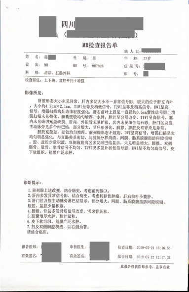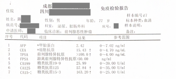 用藥前,患者診斷為前列腺惡性腫瘤,腫瘤標(biāo)志物前列腺特異性抗原高達(dá)100以上。隨后聯(lián)合注射用綠原酸和抗前列腺癌藥物治療。用藥1年7個月期間,前列腺特異性抗原逐漸下降至22.59,生活質(zhì)量改善。22年1月因新冠去世。